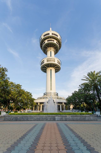 Banharn-Jamsai Tower, located in Chalerm Phrakiat Queen's Park in the heart of Suphan Buri on Nang Phim Road, Taphiliang Subdistrict, is the first and tallest tower in Thailand, standing at 123.25 meters high. It features observation decks, telescopes, souvenir shops, snack bars, and exhibits on Suphan Buri's history, literature, culture, and attractions. The park includes flower gardens, palm gardens, fountains, slides, and a musical fountain.