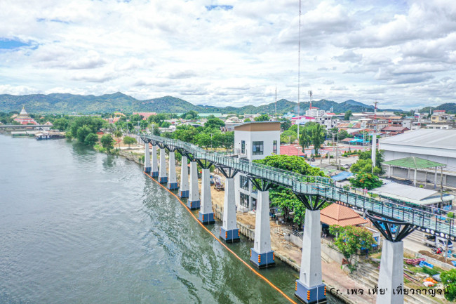 The Kanchanaburi Skywalk is a new landmark of the city, offering panoramic views of the River Kwai, the riverside communities, and the mountains with a blue sky backdrop. Best visited at sunset for spectacular views.
